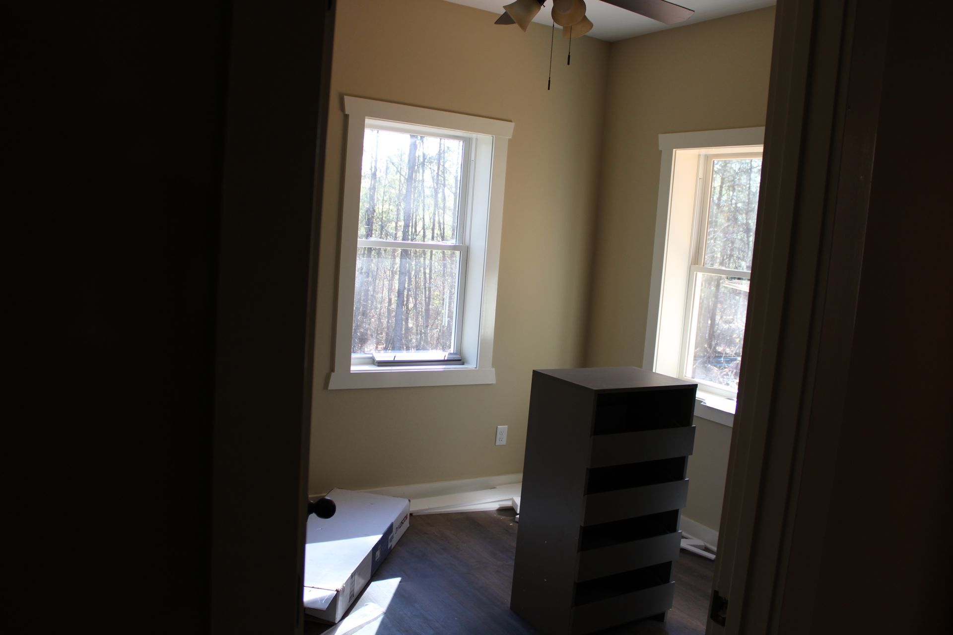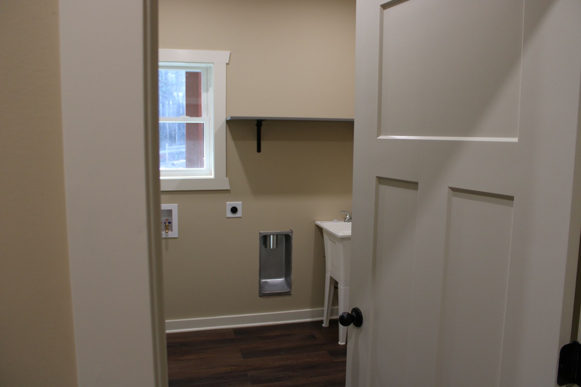Black and white silhouette of a house with a door, two windows, and a peaked roof.